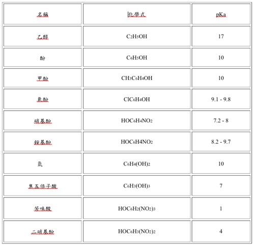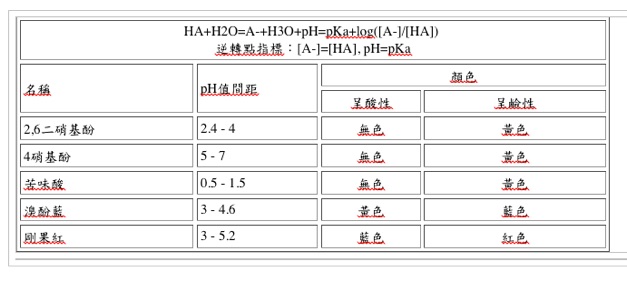 表二 列出理論的推演。指示劑的反應取決於物質的 pKa 值及發色基的顏色。