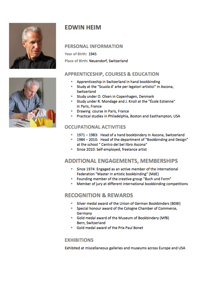 2015年一月三十日,敝人於國家圖書館講「三十年德國古書修復.抄補法」,並在演講廳前舉辦一個「藝術裝幀書展」,展出三位歐洲裝幀大師: Luise Karl、Natterer Susanne、Ingela Dierick用紙、羊皮作成的精美書與盒,皆是傳統裝幀技法,細節精緻之極,不易立即透視其結構,Heim的小品正是引路石.