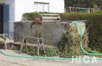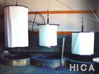 ← 四公尺深的藍靛染缸,每次先清理舊泡沬,再補充入靛,攪缸 將固定於鐵框架的白布下缸 - 浸染,提出滴水,氧化,再垂下浸染 - 提起 - 如此重覆十次