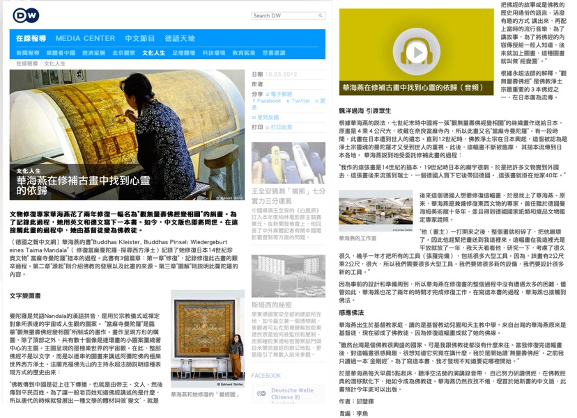 (德國之聲中文網)華海燕的書"Buddhas Kleister, Buddhas Pinsel: Wiedergeburt eines Taima-Mandala"( 修復當麻曼陀羅--探尋西方淨土)記錄了她修復日本14世紀珍貴文物" 當麻寺曼陀羅"描本的過程。此書有3個篇章:第一章"修復",記錄修復此古畫的艱辛過程。第二章"源起"則介紹佛教的發展以及此畫的來源。第三章"圖解"則說明此曼陀羅的內容。