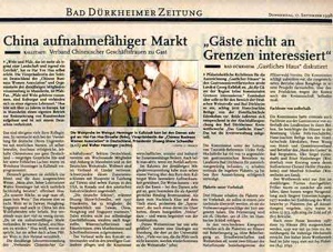 十八點一到,全體成員準時乘車開往 Pfalz 的小鎮 Kallstadt,一路入眼迎來的盡是九月的蒼綠和道旁望不盡的葡萄園,大約十分鐘後,車子開到一所古老的房子前,原來這裡就是享有盛名的 Weinhaus Henninger,當晚大夥就在這家裝修古樸的餐廳裡,酒酣食熱,享受了一份豐盛的套餐,在整個用餐過程中,大夥一共享用了五種名酒,其中飯前酒為:1976 年的 Kallstadter Saumagen Riesling Beerenauslese,再來配合前菜(鱒魚里肌+沙拉)上桌的是:1995年的 Kallstadts Annaberg Riesling Kabinett,前菜用畢,女侍又端來了一碗酒香噴鼻的濃酒湯,既然是酒湯,其中材料自然少不了好酒(Silvaner 白酒),而配著這碗湯所喝的酒亦為同名白酒:1997 年的Kallstadter Silvaner Kabinett,就在兩杯醇酒和一碗熱湯下肚後,好幾位會友的粉頰上已霞光稍透,話匣子也接著打開了。第三道上桌的盤子裡放的是當晚的主菜:小牛腱 + 餐廳自製的麵條,再配上 1994 年的白酒:Hexheimer Honigsack Weissburgunder Spaetlese,吃完主菜,女士們已經香汗淋漓大喊吃不下了,可是面對誘人的甜點:澆了香草汁的蘋果捲及羊奶酪(兩種任選其一),最後還是食指大動,向誘惑低頭了。配合甜點上桌的名酒為:1995 年的 Kallstadter Saumagen Riesling Auslese,到此,整套全餐才算吃。畢當晚還有兩家當地報紙 Rheinpfalz Zeitung 以及 Sonntag Aktuell 的記者在場攝影及採訪。