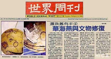 猶記得一九九二年替鈕侖堡博物館為一項名為「新大陸的發現」之展覽而修復的幾個地球儀,其中最古老的地球儀上,尚未有北美洲、南美洲,那時的人已經有了地球是圓的概念,世界地圖上大致沒有錯,中國大陸和台灣都已被畫入精確的位置裡。華海燕所接的另一對地球儀是一六九六年CORONELLI為一位王爵所作的,其中在澳洲下方有一個捕鯨圖,因為大戰時藏在地下室,受水浸破損了一個大洞,博物館希望能補回這塊補鯨圖。於是工作室投注了大量的人力做研究,發現同樣的地球儀在維也納國家圖書館有第二個,經過特殊的照相技術放大縮小,使圓的球形照成平面,將破損的內部石膏一層層補回,再用染過色的舊紙照相複印,先後花了超過兩百小時的工作量,終於恢復了它舊時的風采。