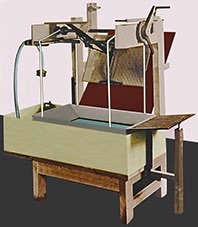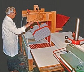 Diskutiert wurden die Vor-und Nachteile der beiden von mir vorgestellten Beispiele für Methoden der Anfasertechnik. Das erste war die Maschine von Herrn G. Bagenda, die dieser für das Institut für Bestandserhaltung und Restaurierung der Bayrischen Staatsbibliothek in München gebaut hatte. Diese Maschine funktionierte manuell.